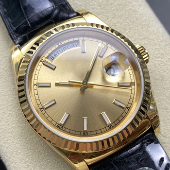 นาฬิกาหรูออกแบบโลโก้ได้ตามต้องการสายหนังหน้าปัดสีทองพร้อมแสดงปฏิทินและสัปดาห์